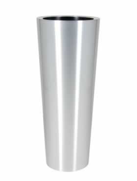 Eenvoudige metalen planter voorzien van een kunststof binnenbak.Geborsteld lijkt het een bescheiden planter, terwijl de gepolijste uitvoering meer aandacht durft te vragen.