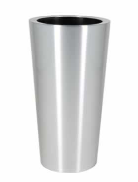 Eenvoudige metalen planter voorzien van een kunststof binnenbak.Geborsteld lijkt het een bescheiden planter, terwijl de gepolijste uitvoering meer aandacht durft te vragen.