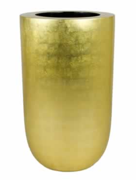 Aziatisch bladgoud op een dubbelwandige, kunststof planter. De blote body wordt eerst gepolijst om een gladde ondergrond te verkrijgen voor de flinterdunne goudblaadjes. Zij worden met de hand aangebracht.
