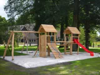 Deze variant van de Fluit bestaat uit 2 Torens 4-kant + DAK 2X + schotelzitje + glijbaan + glijstang + sportenladder + klauternet + oploopschot + kettingbrug 2,50 m. (foto ter illustratie)
