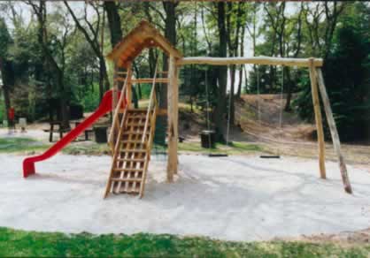 Toren 4-kant + DAK + dubbele schommel + glijbaan + oploopschot + klimnet (foto ter illustratie, verschillende opstellingen mogelijk)