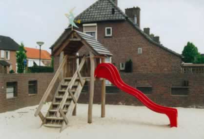Toren met dak – glijbaan + variant trap (foto ter illustratie, verschillende opstellingen mogelijk)